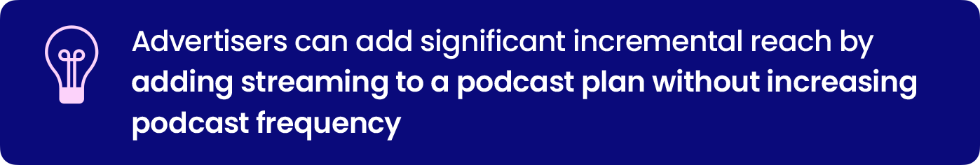 We used the Experian device graph to identify households that were served podcast ads and households that were served streaming ads, then compared the two groups to understand overlap and unique reach. Only aggregated results are shown.